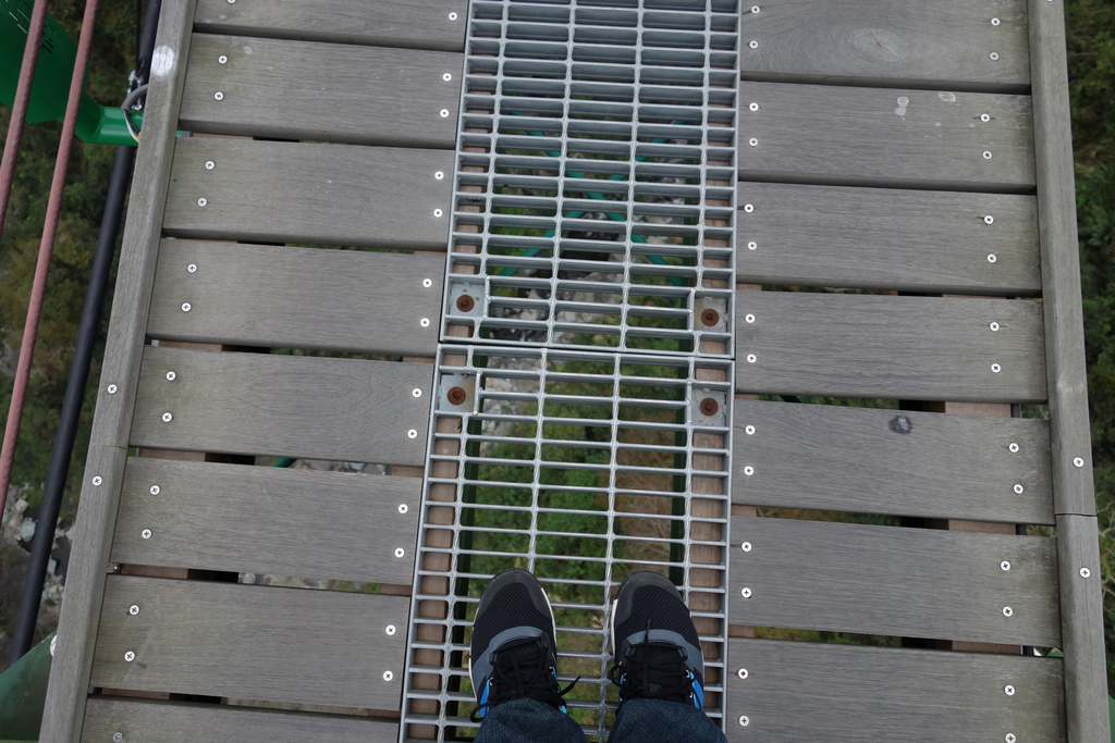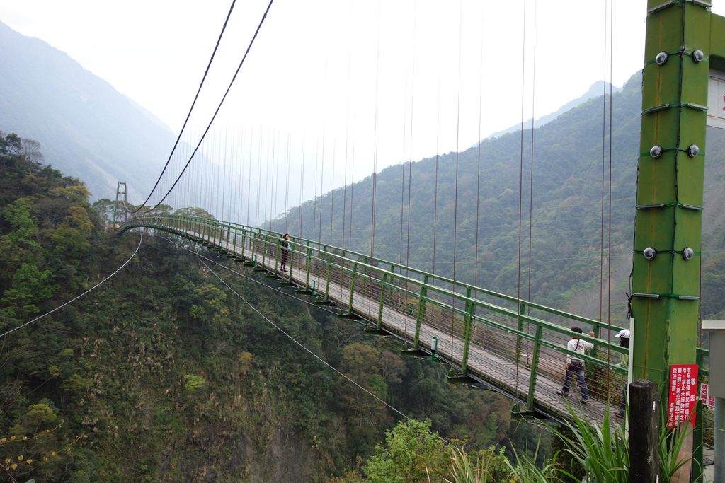 東埔吊橋側拍,整座吊橋橫跨一百多公尺深的山谷