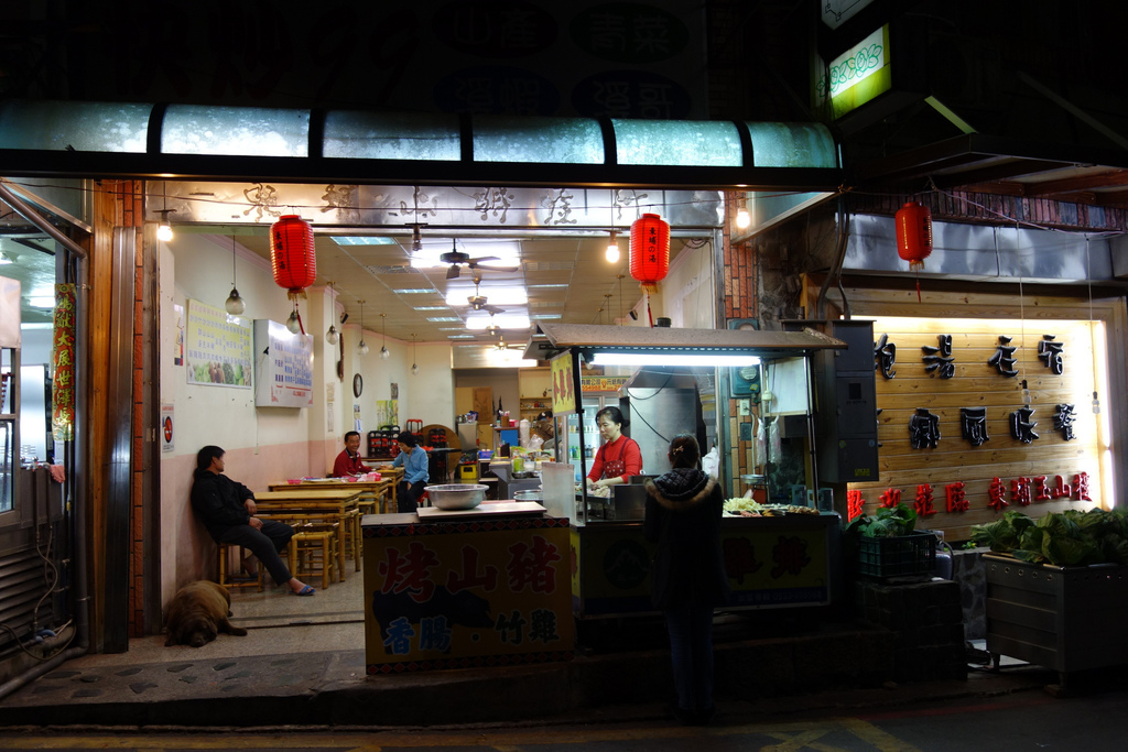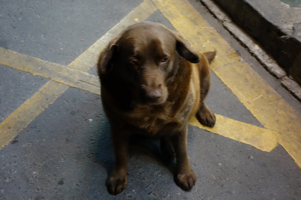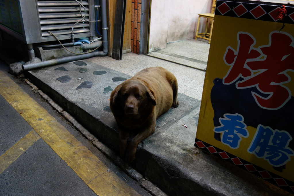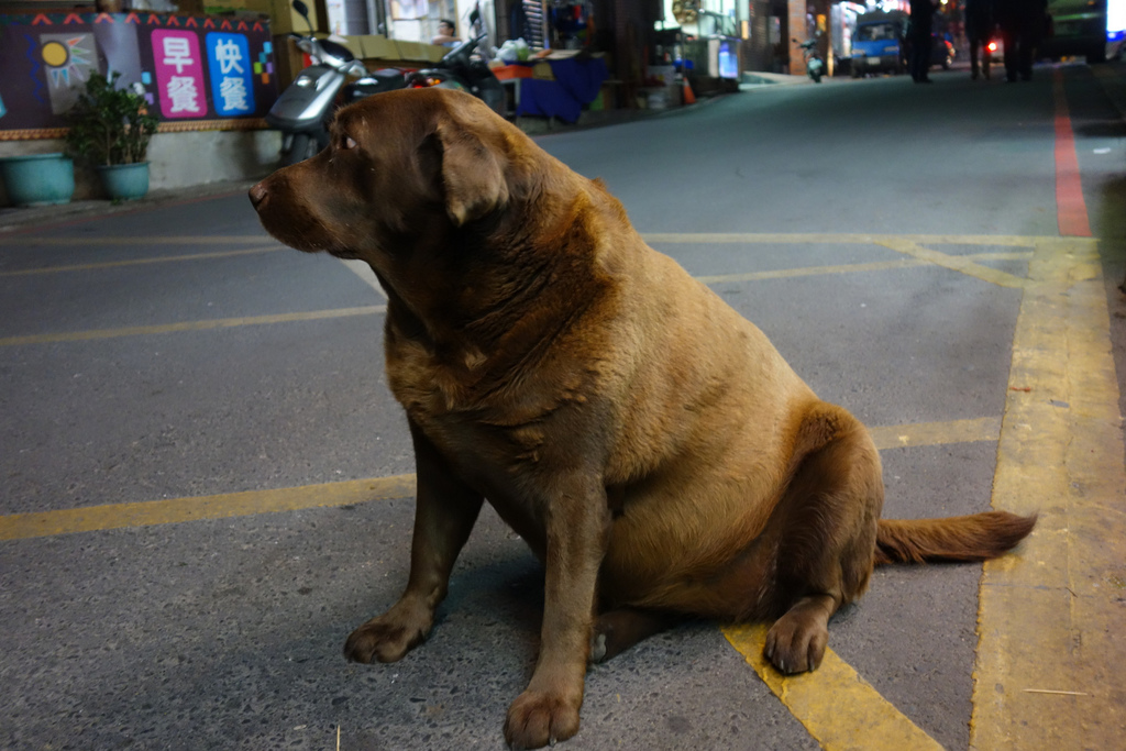 小吃店的狗狗,養的超級胖胖的,好可愛啊,這隻狗狗長得很像拉不拉多,被主人養得像山豬一樣胖,他在小吃店慵懶的顧門口,我拿相機拍他的時候,揮揮手他就跑到我身旁讓我拍照,好想捏它的臉喔!!!