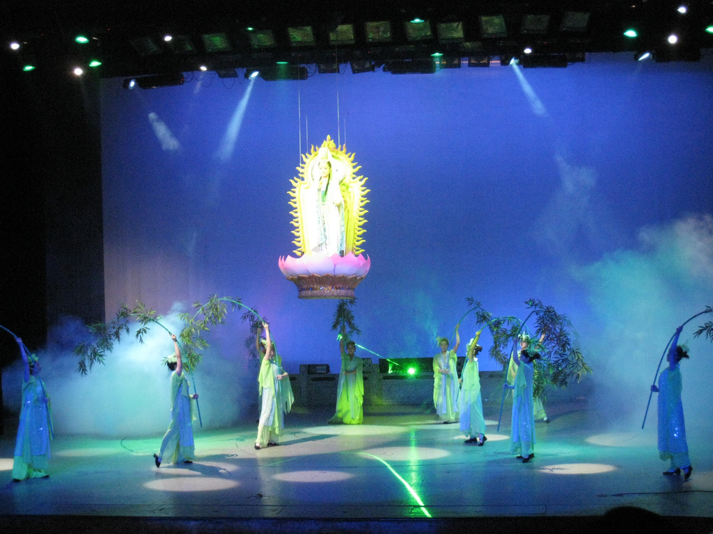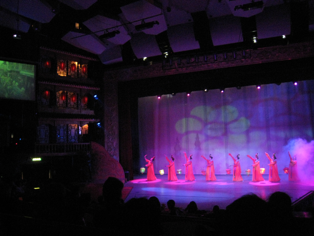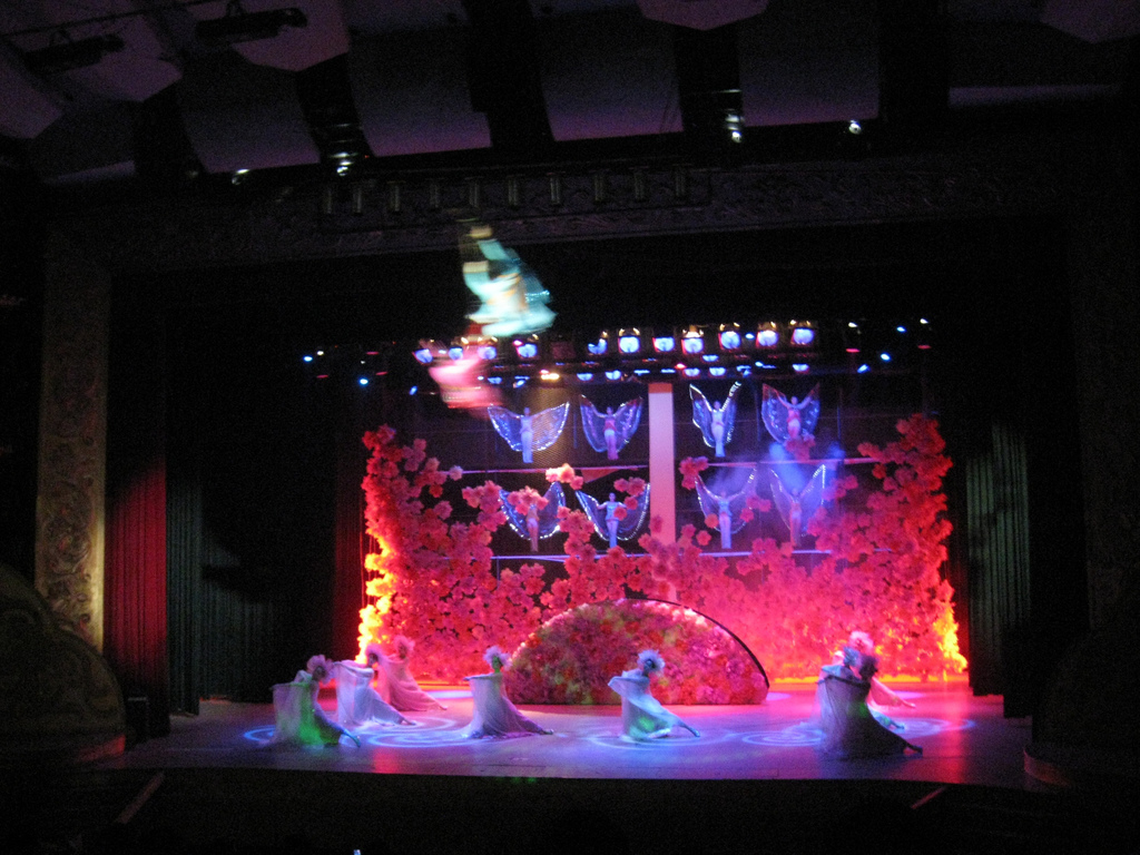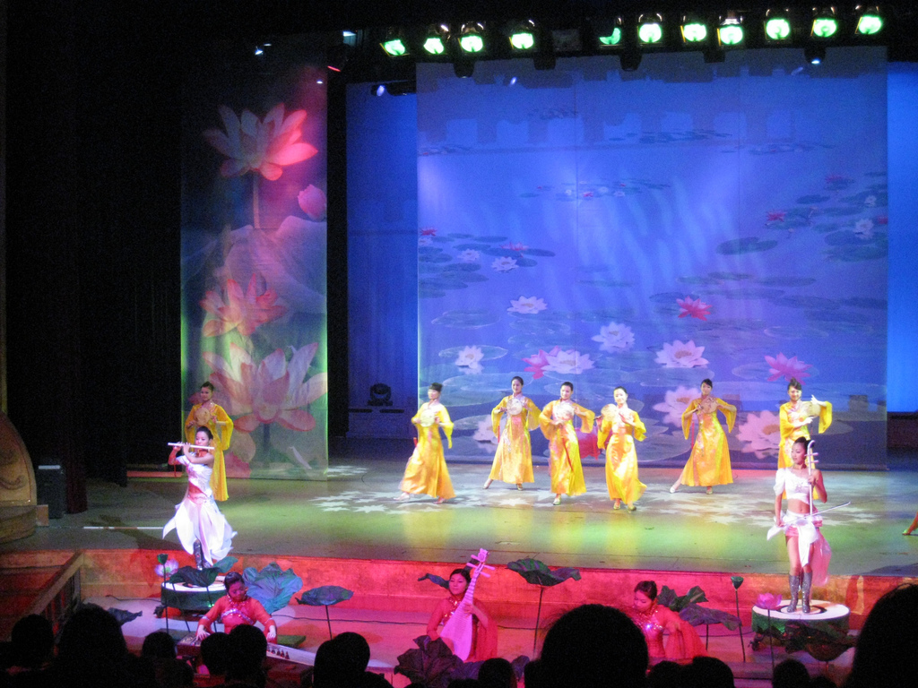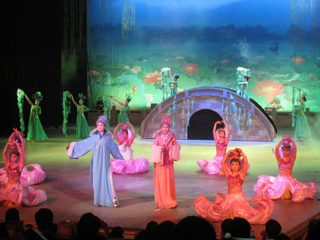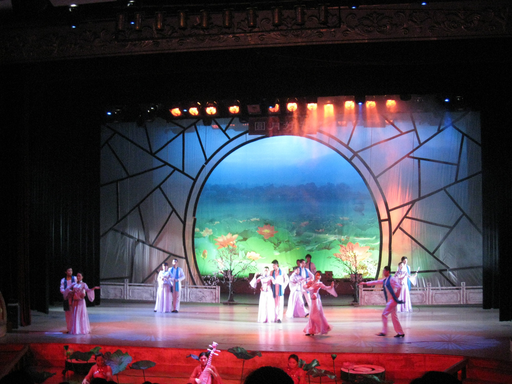 西湖之夜部分場景是採用現場樂器演奏,舞台上舞者婀娜多姿跳動,前方有樂者彈奏樂器,前面有兩位女生最為醒目,一位吹笛子一位拉二胡,兩位的裙子不斷的飄動,搭配上身體的搖擺,真的很迷人啊!! 更有趣的地方是兩位舞者的裙子飄動,下面有一座大型電風扇在吹動..非常有意思! 到現在我還忘不了他們