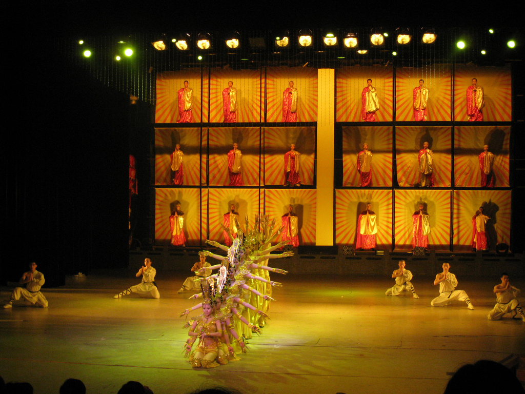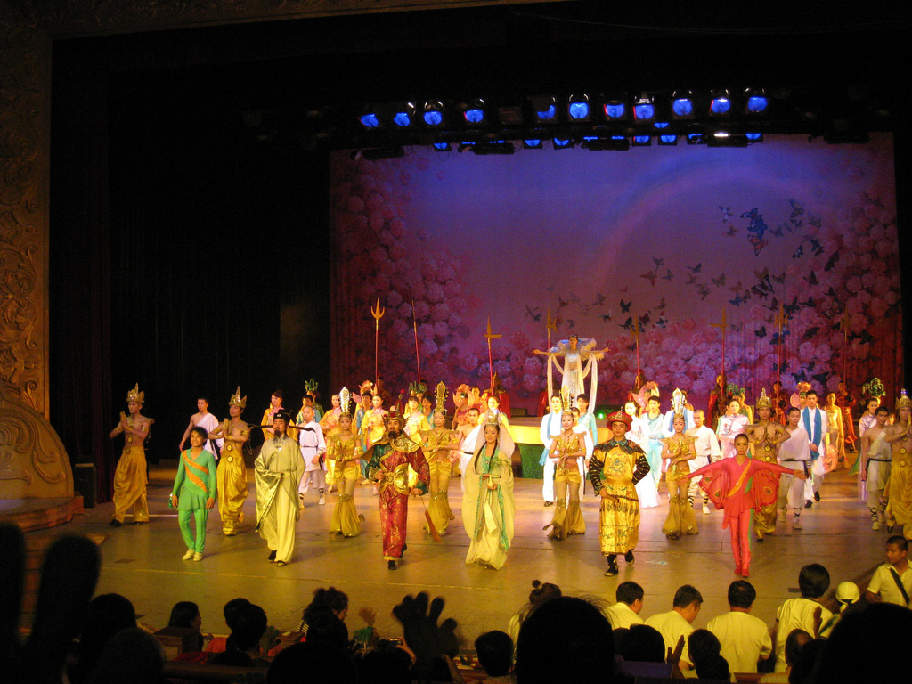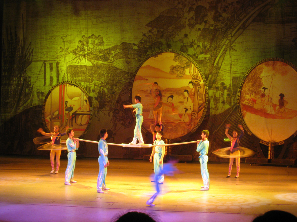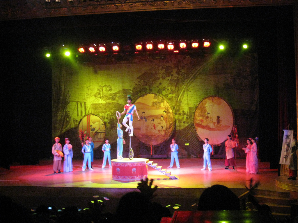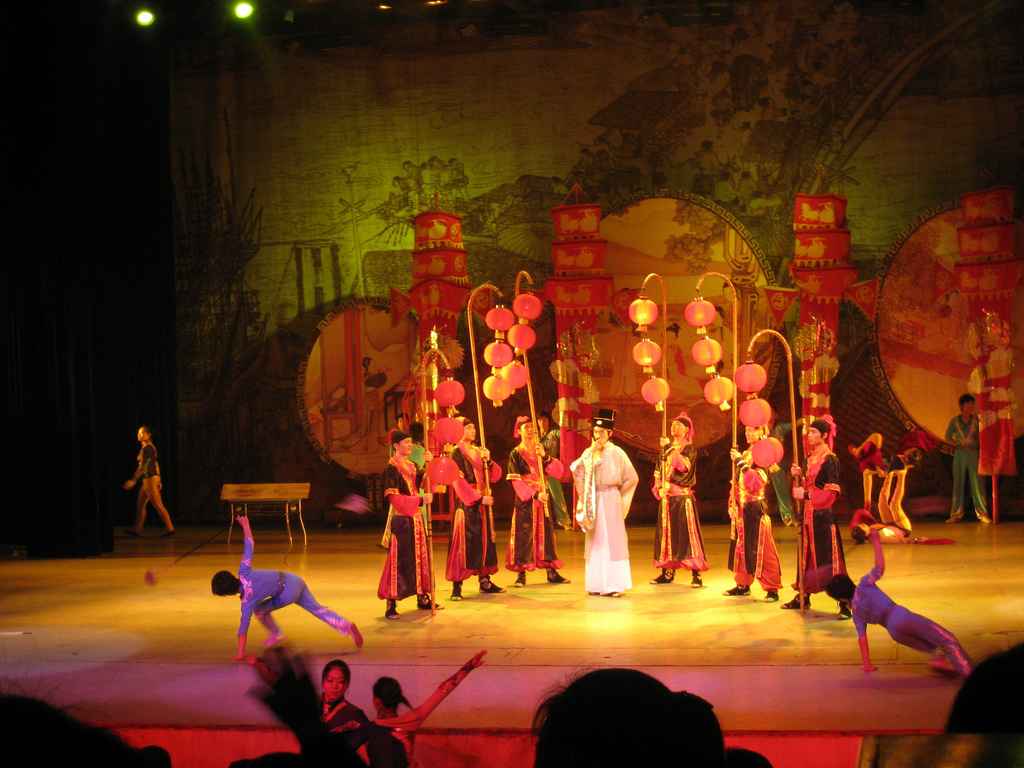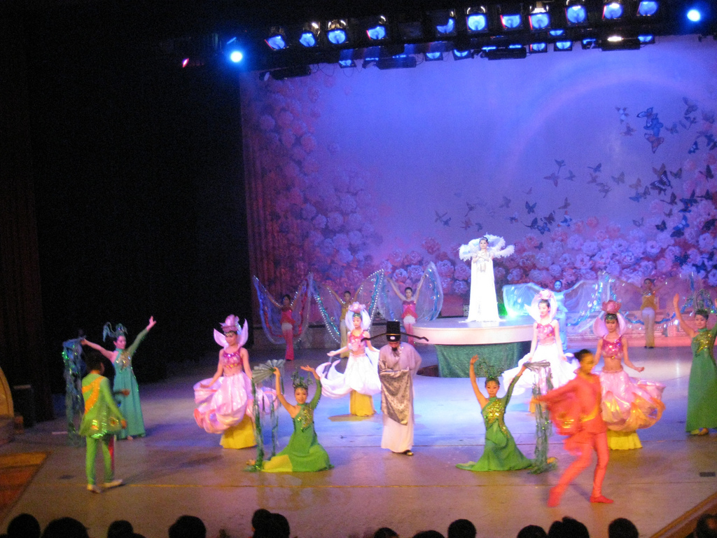 西湖之夜部分場景是採用現場樂器演奏,舞台上舞者婀娜多姿跳動,前方有樂者彈奏樂器,前面有兩位女生最為醒目,一位吹笛子一位拉二胡,兩位的裙子不斷的飄動,搭配上身體的搖擺,真的很迷人啊!! 更有趣的地方是兩位舞者的裙子飄動,下面有一座大型電風扇在吹動..非常有意思! 到現在我還忘不了他們