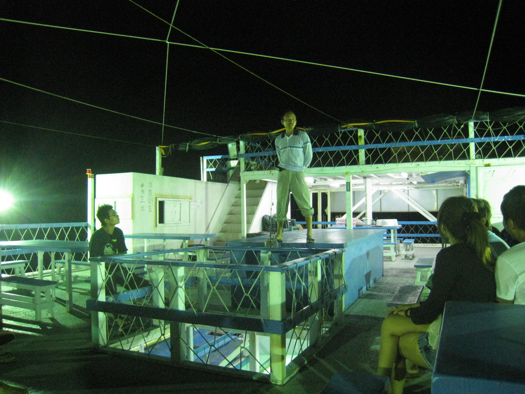 首先船家會開始講解要如何夜釣小管,這個船家很認真工作,白天在員貝嶼帶客人生態覽導,晚上還要上船解說夜釣小管,真忙碌啊!!