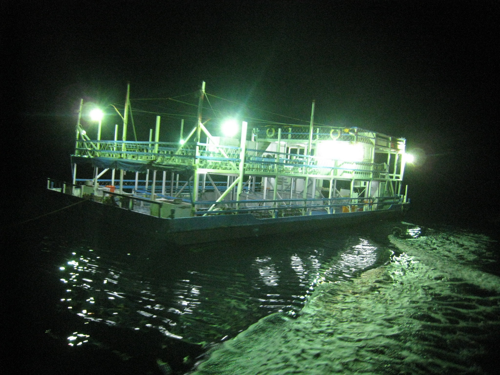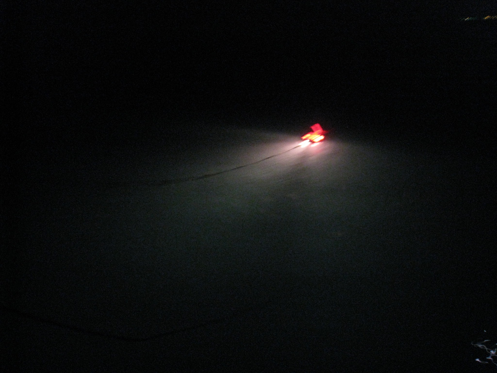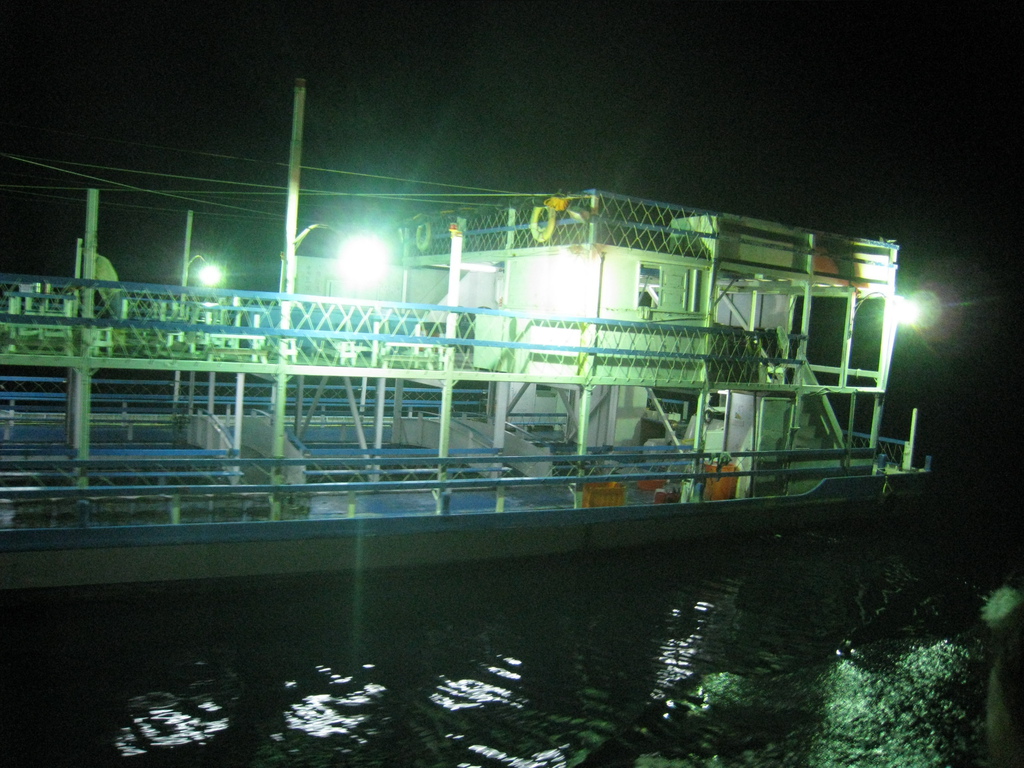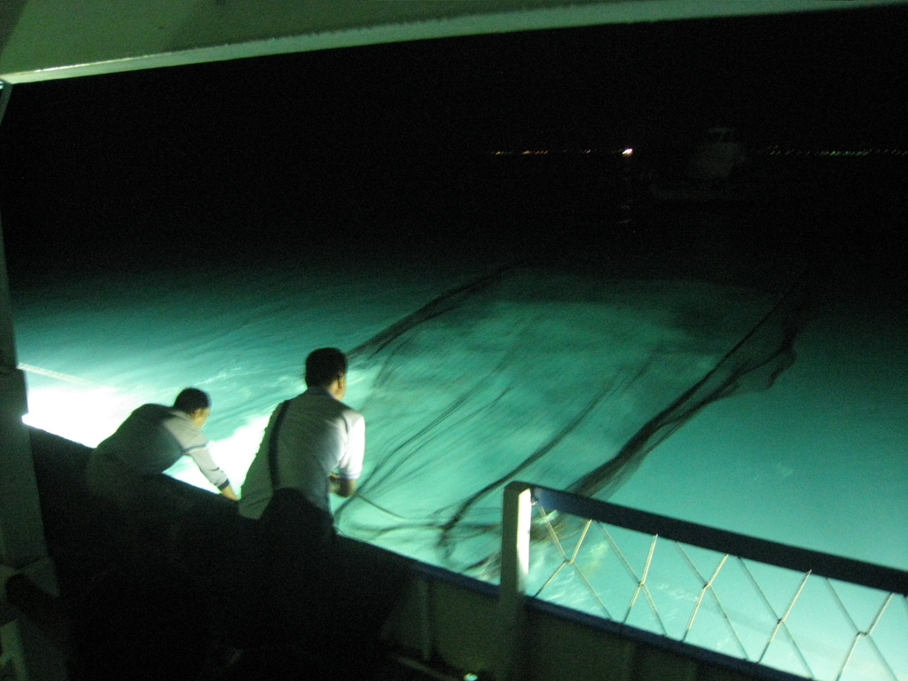 接著重頭戲上場,既然釣不到就用撈的吧,船家從船上投入一顆大燈到海裡,投燈的作用是要讓小管靠近之後,再收網一網打盡