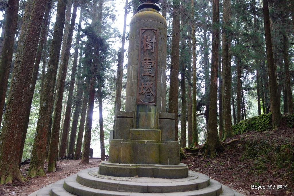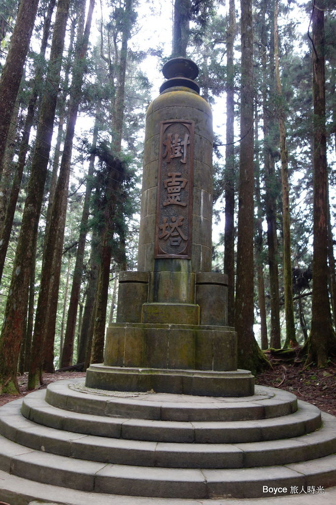 日據時代砍伐的阿里山神木,大多具有兩、三千年的歷史,因此「樹靈塔」的底層建有6層環狀物,主要是代表樹的年輪,每層環狀物代表500年,「樹靈塔」的外圍週遭都是後來再栽植的杉林。